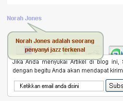 Tutorial blog kali ini saya akan membahas tentang memasang Tooltip di blog. Bagi temen-temen yang belum tahu saya akan jelaskan Tooltip adalah tampilan informasi dalam bentuk teks (bisa juga gambar) yang muncul ketika kita melakukan mouse over ke dalam suatu item di website. Biasanya Tooltip berbentuk kotak kecil yang melayang di atas item tersebut. Jika temen-temen penasaran dapat dilihat disini. Klik pada tulisan Norah Jones maka akan muncul tooltip.
